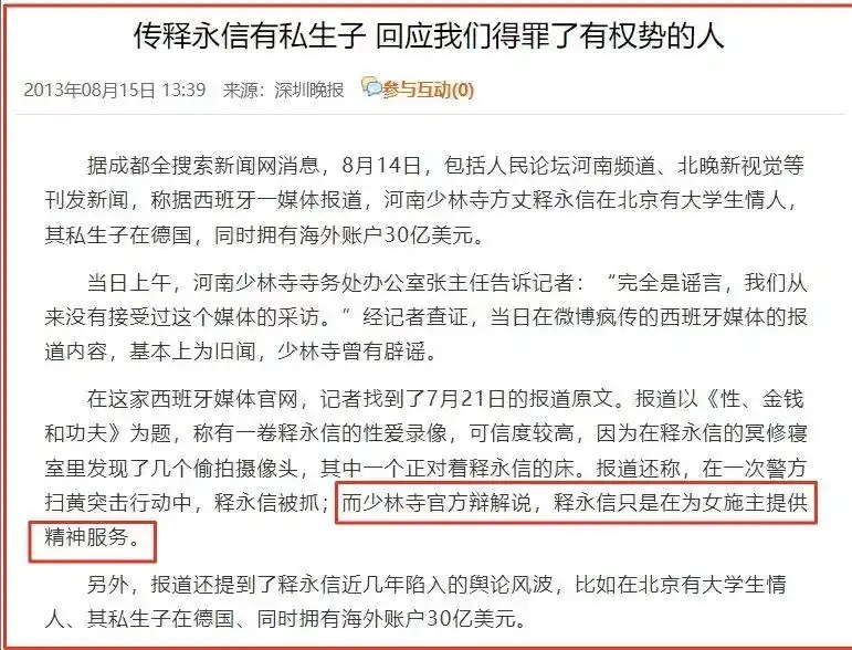 图示:刘力明女士,信徒和女商人,2000年,被释永信允诺过上好日子,怀孕流产, 事后女方追讨承诺的款项,反被释永信威胁和告敲诈, 2015年,随着化名释正义的人士检举,2004年的警方讯问笔录在网路曝光。 释永信塌方后,女方在微博晒出当时沾染精斑的内裤,随即删除。 释永信风波扯出多位女星,比王林 「床上开光 」还恶心 释永信事件爆发后,我脑海里只有四个字 「大开眼界 」。 早在多年前,金庸就给我们做了铺垫,直言 「少林寺原来就是一个暗藏春色,藏污纳垢之所 」,可现在我才发现,还是把问题想得太简单了。 的确,如今网上轰轰烈烈都在指责释永信贪财好色。 这么多年,把少林寺做成一个品牌,从国内赚到国外,肉眼可见的发财,但没想到,说是拓展少林寺文化的开支,最后大部分落入私人口袋,还养起了情人、私生子。 前段时间还在为宗庆后有3个私生子气愤,如今看了释永信,真是小巫见大巫。 官媒例举的罪状,触目惊心,让我们对少林寺这个品牌也保持怀疑态度。而且在这么多条症状,事情发生了这么多年后,怎么做到悄无声息了,更令人好奇了。 实际上,释永信暴露以后,网上传出来好多之前就举报释永信的消息,而且当初阵仗也不小。 在2009年、2014年、2015年都有人站出来举报释永信贪污公款,有情人私生子,可后来即便是官媒点名,官方下场亲自调查,结果显而易见。 因此,在质疑释永信案件本身的同时,我又不得不怀疑这背后是否还有其他人?难道光靠释永信一个人,就能撑起这么大的一条船,几次三番出事,都能平安无恙。 现如今,在所有大人物都对释永信事件避之不及的时候,有一个圈内人主动站出来,揭露释永信和娱乐圈的一些肮脏事。 著名导演宋祖德在自己的社交账号评论释永信被抓,称此举动让人们拍手称快。作为少林寺主持,他的种种行为对社会危害性太大,甚至包括娱乐圈。 根据宋祖德阐述,自己几年前在一位女明星家里做客的时候,看到对方家里挂着很大的一幅和释永信的合照。 这本身没什么问题,毕竟圈内成龙、李连杰、范某某都和释永信有合影,不少人慕名而去,想为事业添一把火。 但宋祖德又介绍,这位女星炫耀自己抢到过释永信开光,这可不是一般的福气。 以释永信的社会地位,他开过光,就相当于有释永信背书,但凡是注意这方面的剧组,都会卖一个面子。 最火的时候,就连李冰冰都主动登门。据说当时李冰冰因为母亲病重,医院救治无果后,托人联系到王林,给了一大笔钱,还当场下跪,让他帮忙照顾一下家里人。 甚至有人说赵薇为什么能拍《还珠格格》爆火,就是王林给她开光算命了。 但王林的开光方法,至今都让人嗤之以鼻。他的工具就是一张五条腿的床,不管谁要开光,只要和他出现在这张床上,经过一些手段,就能实现目标。 到今天,宋祖德又曝光了释永信是如何帮助女明星开光的。虽然没讲具体过程,他说不能太具体,毕竟有太多女明星上门找过释永信,有些事情本身就是机密。 不过他能想到的形容词,只剩下恶心,甚至于比王林的还恶心。 https://www.163.com/dy/article/K5KOIPUO05568JTI.html 版按: 释永信,出家的和尚,竟然富可敌国、后宫佳丽三千,如网上资料显示他拥有庞大的商业帝国、情妇团队、私生子团队,房产证以几十公斤计算,媒体已经诸多报道,对於普罗大众来说,只是茶余饭後的谈资。 但是对於佛教徒,忧心的却是佛法的未来,佛教的存亡,众生的法身慧命。世俗人不懂得三宝的尊贵,虽然真正的佛门出家人不事生产,可是他们代表了佛教,而三宝对於众生心灵的教化和启迪作用,具有无可取代的巨大影响力。 “开光”亦称“开眼”,原是佛教中的一种宗教轨仪,本意是通过某种庄严的仪式,赋予无生命的物体以生命和灵(神)性。“开光”多用於木雕泥塑的佛像,但也不限於佛像,有时佛塔、佛殿、神幡、神牌等亦须“开光”。(吴秋林著;吴晓梅,罗康隆编,吴秋林文集 第6卷,中央民族大学出版社,2023.07,第137页)《禅林像器》上说: “凡新造佛祖神天像者,诸宗师家,立地数语,作笔点势,直点开他金刚正眼,此为开眼佛事,又名开水明。”(白君著,国学公开课,天地出版社,2016.02,第92页) 末学所知最早的开光记载是东晋的顾恺之,他亲自给在寺院墙壁上画了栩栩如生的维摩诘大士的像,唯独眼睛先没有点出来。然後请人放出他要给画像开眼的消息,吸引信众捐钱观赏开眼以给寺院筹钱。果然,他开眼之後,维摩诘大士的画像更加生动传神,他也实现了为寺院筹措金钱的承诺。 开光後来是佛家道家都存在,被开光的几乎都是物品,有给佛像、遗像、经咒纸张、衣物、手链等饰品,开光以後的生活用品至少都可以避邪。 给人开光,实际上是密宗的灌顶。因为密宗常常把开光和灌顶两个事情,混合在一起使用。如: 灌顶这个佛门专用语早就已经被密宗玷污,原本是指九地菩萨进入十地菩萨位时,十方诸佛为其放光灌顶,得金刚三昧。 如何请求金刚上师传授此秘密灌顶?