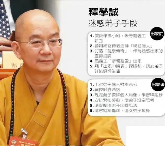 日常法师是十分受D赖重用的弟子,此次带着上师的叮嘱,来到大陆发展信徒,弘扬《广论》,又怎么会拒绝一个主动送上门的年轻方丈呢?而且还是大陆“三大样板丛林”之一的广化寺方丈。 两人各有所谋,一个为了发展大陆信徒,一个是为了引进台湾“福智”团体先进经验,帮助自己摆脱寺里那些人的影响。 此后,学诚开始了求法的道路,趁着两岸来往密切之际,打着交流参访的旗子,利用福建佛学院寒暑假期间,经常去台湾日常法师处凤山寺学习。 07.凤山之主 日常法师,1929年出生于江苏省崇明县人(今上海市崇明区),1949年因避战乱随叔父到台湾,曾就读于台湾成功大学。37岁出家,46岁开始学习并弘传《菩提道次第广论》。1986年,58岁的日常法师去了印度达隆色拉(达兰萨拉)辩经学院求法,并在此地皈依了流亡在外的D赖喇嘛,日常法师的根本依止上师即是D赖。1986年及 1987年,日常法师每年都会独自前往印度求法三个月,而D赖对热衷于弘法的日常法师非常看重,希望他回去后大力弘扬《广论》。 1986年,日常法师住持台湾新竹县福智寺、凤山寺,并创建“福智”佛学院,积极去各地宣讲《菩提道次第广论》。 1992年,创办“福智”团体,成立比丘、比丘尼僧团。 在随后的几年里,“福智”团体通过举办夏令营、学校、慈善,还有基督教“家庭聚会”式学佛小组,迅速扩大规模。 由于《广论》系统、次第的特点,吸引了大量高知学佛,加上创始人日常法师具有理工大学的背景,其发展的弟子多有高级知识分子和社会精英。 而学诚正是看重了这点,他无比渴望能够学习到“福智”团体的创业经验。 其实,“福智”团体所开办的《广论》学习班无非是效仿基督教传教、直销等模式而已。 《广论》学习班,每周一次共学,按行业或相应的圈子分班,由学员在周边圈子“拉人头”,组成一个学习班,相同的经历、教育背景,再加上宗教的因素,让这群人愈来愈依赖“福智”团体。 此外,“福智”学员只学习师父(即日常法师)的开示、语录,基本不学习体系外的内容,实践《广论》中的依师法类,以及“观功念恩”法门,由此向社会大众推广。 而“福智”团体在部分地区有自己的中、小学校,学生基本都是“福智”学员的子弟,影响很大。 08.借鸡生蛋 2000年,五一法会期间,日常法师再次来到广化寺,学诚安排僧众从山门排班,以隆重的仪式将日常法师迎请入寺。 随后,学诚私下与日常法师达成了协议,将广化寺作为大陆弘扬《广论》的根据地,由“福智”团体上座法师指导。 日常法师希望借助广化寺来发展信徒,完成上师D赖的要求,而学诚何尝不是希望借助“福智”团体成熟的经验建立起属于自己的帝国? 5月21日,朴老离世。这一年,学诚34岁。面对众多长辈为了佛教发展,帮他铺好的路,已经做了十一年方丈的学诚仿佛看到了一丝曙光。 这些年他逐渐在寺内有了话语权,培养的亲信也慢慢成长了起来,学诚离他的梦越来越近,他恍然间看到了年少时在北京读书所看到的那些人和事,他终于也快要做真正的大和尚了。 2001年初,日常法师派其弟子梵因法师、如亨法师常住广化寺,成立了广化寺常住《广论》班。 梵因法师是总负责人,“福智”僧团的其他执事法师也轮流被派到莆田广化寺,对广化寺和福建佛学院进行全面的指导、教学以及管理。 来自台湾的法师沿用“福智”僧团比较成熟的团队管理经验和理念,在广化寺培训僧众骨干,学诚要求广化寺和福建佛学院的执事法师多亲近台湾“福智”僧团的法师,多向他们学习和请教。学诚自己也会去常住《广论》班旁听学习。 至此,台湾“福智”僧团已然成为了广化寺的中枢,学诚也初步尝试将广化寺的传统丛林制度慢慢转化为“福智”团体模式,并准备在此基础之上,最终建立起属于他的帝国。 09.众贤云集 其实在此之前,日常法师早已派他的得意弟子李衍忠居士到北京开办《广论》研讨班,发展了清华大学、北京大学、北京航空航天大学等高校的高材生参加《广论》学习,并尝试向全国推广。 上世纪90年代,是一个世界格局极其动荡的时代,东欧剧变、苏联解体,中国也刚从十年浩劫的影响中走出来,改革开放,很多人下海经商,国家经济飞速发展,人口流动多,而很多知识分子除了气功热外,更想寻找一个可以让精神栖身之所。 90年代初,李衍忠来到北京,结识了北航的年轻教师程某,程某即是后来“福智”团体在大陆的总代理。程某发起建立了“北航广论研讨班”,随后他们在高校圈推广,“清华大学广论研讨班”“北京大学广论研讨班”由此产生。 由于《广论》看起来系统全面、次第分明,这些高知分子极其相应,于是沿用台湾《广论》学习小组的模式,同宿舍、同专业或同行业的人组成一个小组,共同听日常法师的录音磁带,一起研讨学习。 2001年10月,日常法师来到广化寺参加法会、讲学,在这一年,日常法师安排凤山寺具有良好教育背景的法师常住广化寺指导,并开办广化寺《广论》常住班,因此,早已追随凤山寺日常法师学习《广论》的一批知识分子陆续来到广化寺常住班学习,发心出家。 而这一次法会,一群跟随日常法师学习《广论》的年轻居士自北京结伴来到莆田广化寺参加法会。临走之前,日常法师和学诚与大家见面座谈,有人问道:“非常感谢法师提供这样的条件让我们来跟随日常老法师学法,不知这里有什么困难,我们能帮到什么忙?”学