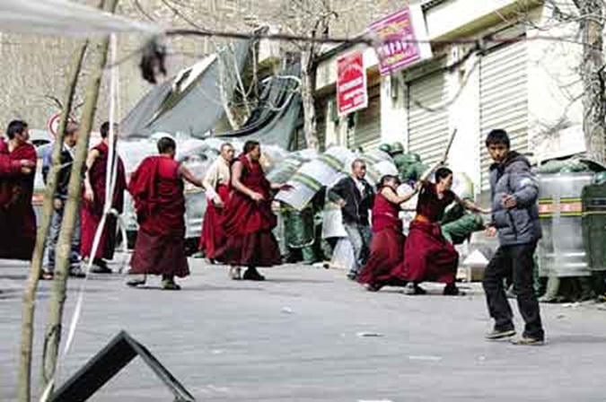图示:2008年西藏暴动时,拿起武器破坏他人财物的喇嘛们! 就算有所不满,也应该通过其他方式沟通,而不是破坏不属于自己的、无辜百姓的财物。 何况喇嘛们心中永远默认的精神领袖是达赖喇嘛,将年轻的信徒们送到枪口下, 自己养着宠物、健着身,私下修着性交术,快乐得很!