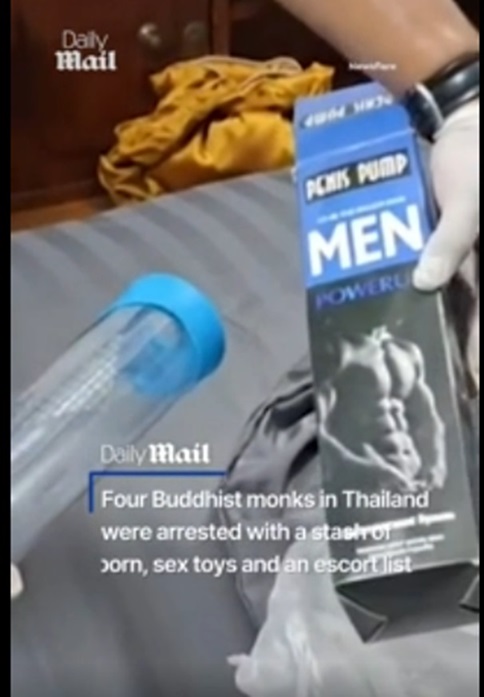 泰国警方突袭四名僧侣的寺庙,查获大量色情物品、性玩具、阴茎增大泵和妓女名单, 四名僧侣因此被捕。 1月27日,警方接到举报称这四名僧侣持有枪支和毒品后,突袭了他们的住所。 ( Phrom Sunthon Monastery in Chonburi province)
