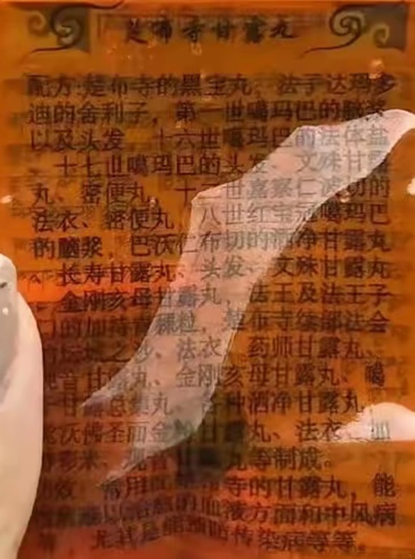 (图示:原图片发布者所拍摄楚布寺恐怖的、添加人脑浆的甘露丸配方。)