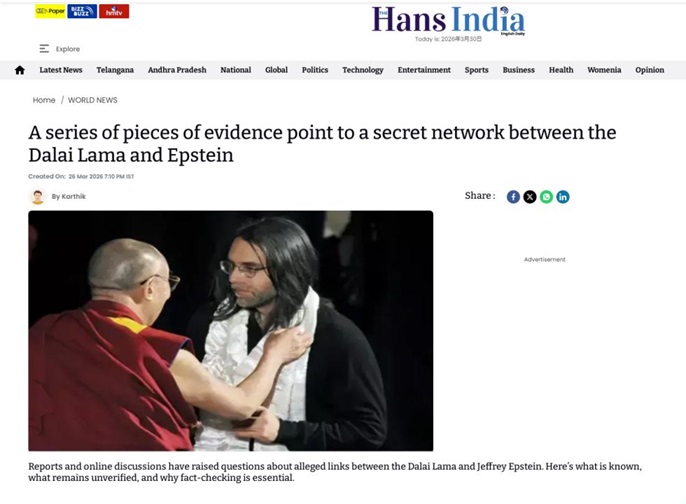 那个自称“观音菩萨化身”、被某些西方势力捧为“和平使者”的十四世达赖,他那套苦心经营几十年的“慈悲”人设,真的碎了一地! 这次是因为——他与臭名昭着的美国恋童癖富豪杰弗里·爱泼斯坦搅在了一起。 印度媒体“汉斯印度网”最近又捅破了一层窗户纸,抛出新证据。一封接一封的邮件,实锤频出。 报道称,调查逐渐揭开了十四世达赖与爱泼斯坦之间“令人不安的秘密联系”:原来,达赖,竟是爱泼斯坦的座上宾。  “汉斯印度网”报道截图。 时间回拨到2015年5月。 爱泼斯坦在给电影导演伍迪·艾伦及其妻子的电子邮件中写道:“我打算邀请达赖喇嘛吃晚餐。”这仅仅是冰山一角。 早在2012年8月,爱泼斯坦的电子邮件中就已出现蛛丝马迹:
