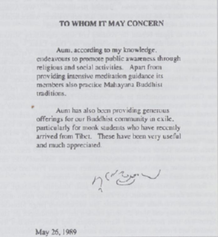 达赖出现在爱泼斯坦档案中的查询情况。图片来源:“欧盟记者网”报道  图为达赖为奥姆真理教亲笔签署的声明。 大意如下: