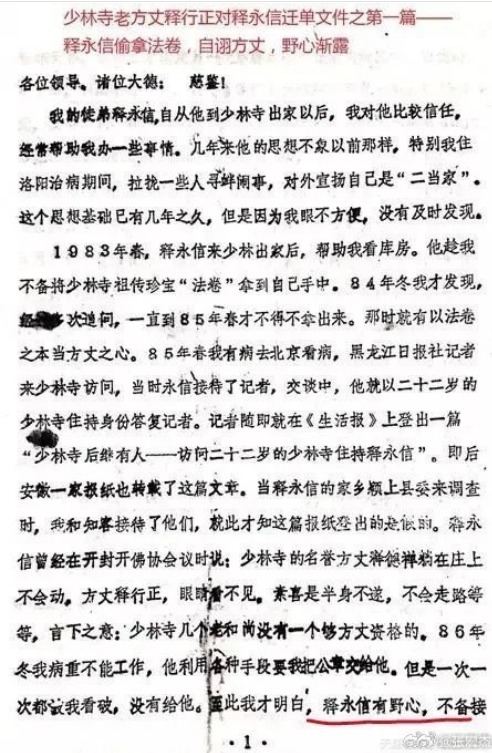 前言 16歲出家,21歲擔任少林寺管委會主任主持事務,34歲榮膺少林寺方丈。 看到釋永信的這份履歷,古往今來皆罕見,而在他之前的前一任方丈,釋永信的師父釋行正接任方丈時已經年72歲。 那麼釋永信為何會這麼年輕就接任少林方丈?他的這些“罕見”背後又有什麼原因? 少年入寺,嶄露頭角 1981年,年僅16歲的釋永信懷著對佛教的虔誠,來到了嵩山少林寺,拜在第二十九代方丈釋行正長老座下,開始了他的修行生涯。 那時的少林寺,雖然歷史悠久,底蘊深厚,卻面臨著諸多困境,寺廟的建築年久失修,僧眾的生活艱苦,宗教活動受到重重限,盡管如此,釋永信並沒有因環境的艱難而氣餒,反而更加堅定了自己修行的決心。 他每天隨師父和僧眾誦經、打坐、習武,專心鑽研佛法,不僅如此,他還主動參與寺院的各項事務,做得一絲不苟,得到了師兄弟們的認可和贊賞。 釋永信不僅對佛教經典有著濃厚的興趣,並且常常深入經堂,研讀佛教經典直至深夜,他還在修行中展現出了卓越的悟性,深入理解佛教教義,常能提出新穎的見解,這使得他在寺內逐漸嶄露頭角。 與此同時,釋永信也積極學習現代知識,拓寬自己的視野,為將來擔任寺院管理工作做了充分准備。 1986年,21歲的釋永信因為在寺院中的出色表現,被推選為少林寺管委會主任,開始全面主持寺院事務。這個年輕的僧人憑借自己的智慧和勇氣,開始為少林寺的未來鋪路。 作為管委會主任,釋永信面臨著寺院管理體制亟需改革、僧眾生活條件需要改善等種種難題,不過他並未被這些困難嚇倒。 與之相反,他深入了解僧眾需求,傾聽他們的意見與建議,對寺院管理體制進行了一系列改革,提升了管理的規範性與科學性。 同時,他積極爭取社會各界的支持,為寺院的修繕和發展籌集資金,改善了僧眾的生活條件,而命運卻在1987年悄然轉折。 就在釋永信滿懷希望地繼續推動寺院改革時,一場突如其來的風暴打破了寺院的平靜,1987年5月,釋行正長老臨終前的兩個月,寫信給中國佛教協會,提出對釋永信的質疑。  信中指出,釋永信存在諸多問題,認為他心懷野心,尚不具備接任方丈的資格,信中列舉了釋永信的一些行為:偷拿法卷,稱自己為方丈等,這些行為在佛教寺院中被視為極為嚴重的違規行為。