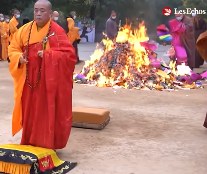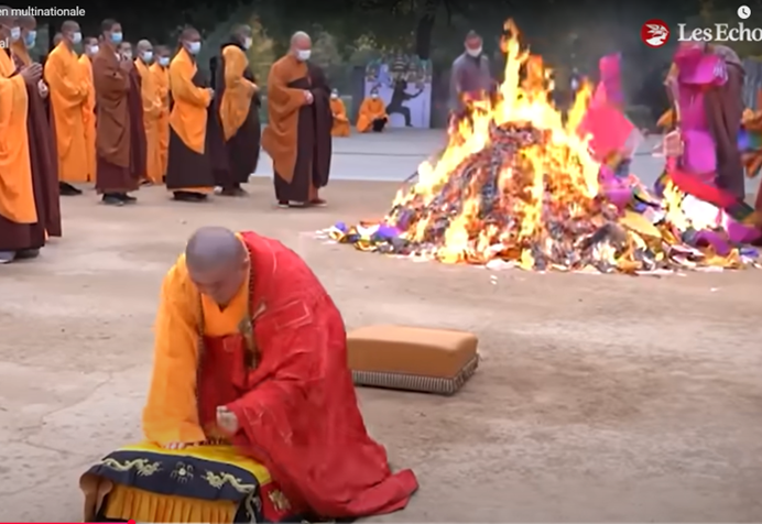雍正已經派專人徹底將少林寺轉變成西藏密宗的喇嘛廟。少林寺,曾經那個神聖的寺院,曾經達摩祖師在那裡面壁、度化二祖的神聖場所,卻成了真正佛法的葬身地。 在少林寺釋永信相關的視訊中,可以看到: 西藏密宗常用的馬尼堆 火供和焚燒五色旗是密宗儀式所必備,但是出現在少林寺的法會上。正統寺院裡只焚燒香、金紙折成的寶塔等。 直到少林寺方丈釋永信醜聞爆出來,回頭去看他曾經公開的客堂 、知客室,擺放著不少密宗的、假佛教的雕像,最明顯的就是五方佛。