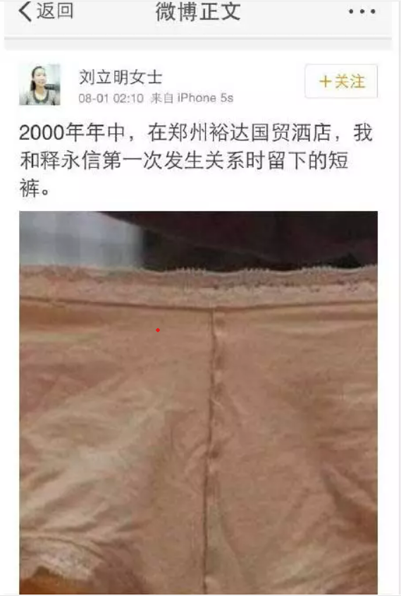 因此,當信眾說釋永信凌晨四點單獨給女信徒開光、灌頂的時候,大陸演藝圈名嘴宋祖德先生也曾爆料,結合釋永信展示出來的德行,我們用膝蓋想也可以知道密室裡都發生了什麼。由此推論,釋永信早就在暗中修學西藏密宗的法了。 其實,早在2015年附近警方在打黑社會的行動中,警方就繳獲釋永信被黑社會偷錄下來的不堪入目的三p視頻,也有被掃黃打非活動現場抓到嫖娼,後來官方給出的解釋是: 為女信徒提供精神服務。