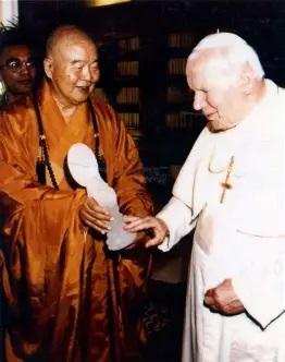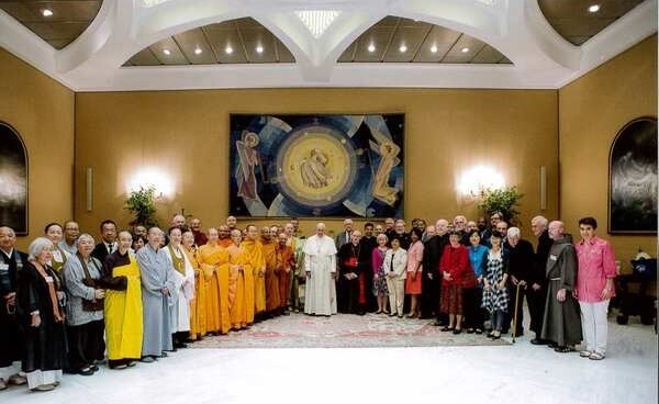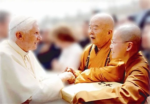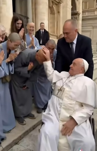 圖示:2015年法鼓山洛杉磯與紐約道場的監院等佛教徒與天主教代表受邀參加 在義大利舉辦的「天主教與佛教之宗教對話」,與教宗方濟各合影。 在天災人禍的年代,如果各大宗教領導人聯合起來追求和平、阻止戰爭的發生是件好事。比如俄羅斯和烏克蘭、巴勒斯坦和以色列的戰爭,但是這些戰爭背後本身就牽扯著許多政治勢力和不同宗教之間的紛爭,除了為難民洗腳、吻足,不曾看到有哪位展示出跨越種族圍牆、衝破宗教藩籬的大愛。 除此危難時刻,各宗教的教義完全相左,會有全球宗教的大一統嗎? 出家人穿上這身僧衣,代表的就是佛門。千里迢迢地去拜見梵蒂岡天主教教皇方濟各,是有幾個層面的用意呢? 是要借助教宗在全球的影響力,讓自己也在國際舞臺露臉,讓西方社會知道有這號人物嗎? 佛法,是 佛陀教導眾生成佛的法、是出離三界輪回苦的究竟道路。基督教、天主教、伊斯蘭教可以教導人類一些善法,可他們能夠教導眾生法界的真實理和修行直至究竟成佛的道路要如何走嗎? 所謂「聖」,在菩薩成佛之道的五十二階位,至少已經入地,已經看不到各種貪嗔癡煩惱的現行。教宗方濟各,既然同樣是所謂獨身修行的修行人,他既是球迷,也是電玩迷,也會去拍打拉扯他的女信徒的手,他的「聖」在哪裡? 雖然他在國際舞臺上的種種表現,超越他的上一世——因為各種醜聞被迫主動辭職的本篤十六世,但背後有其深藏的政治目的和宗教目的。也許在一些人眼中,教宗方濟各具有一定的人格魅力和很高的國際影響力,可是西方稱其為聖,佛門也要跟著稱呼其為聖嗎?在其往生後,法鼓山的悼詞裡面讚美其如觀音菩薩。觀世音菩薩可是 正法明如來倒駕慈航來的,斷我見的菩薩尚且距離觀世音菩薩的修行接近三大阿僧祇劫,何況是連十信位都沒有圓滿的世俗人呢? 圖示:早在1997年2月,星雲法師就曾經去拜見當時的保羅二世教皇,並贈送禮物。 2006年6月,星云再次出访梵蒂冈。 法鼓山、慈濟團體都有派出專人來覲見當時的教宗。 圖示:台灣慈濟執行長顏博文、淨耀法師與方濟各合影。 2023年,台灣百人宗教團體觐見教宗方濟各。 2024年,泰國僧侶覲見方濟各,出家人們如同被訓話的小學生。見下圖: 上圖示:不明人士向方濟各贈送達賴喇嘛的書籍。 2024年,天臺寺的方丈和尚及所率領的尼師們次第接受教皇摩頂: 湖北黃岡市紅安縣天臺寺開山住持釋悟樂方丈,中國佛教協會副會長淨慧大和尚關門弟子, 不愧是密宗活佛的弟子,繼承黃教格魯派應成派中觀、一切法緣起性空,所以任何時候都可以見風使舵, 可以瞬間從佛教徒切換到天主教徒,只是忘記身上那身大領衣和戒疤(不確定其是否有戒疤)。