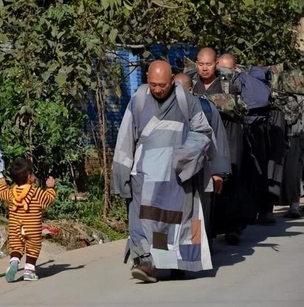 圖示:遼寧海城大悲寺住持妙祥率領眾憎徒步苦行。 身穿百衲衣,頗有幾分古代高僧的樣子,而實際奉行的如果已經不是佛法, 而是西藏密宗喇嘛教邪教導,被世人揭穿其奢華生活和作秀苦行是勢所必然。