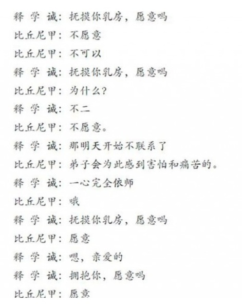 我想,還是早點結束這折磨人的對話吧,我豁出去了!終於我說:“好吧師父,弟子豁出去了:願意。”我想,折騰一周多了,都到這個份上了,一切都該結束了吧。然而,他接著說:“撫摸你臉。”這是讓我一萬個想不到的。又是一個晴天霹靂!我不知道還能夠回應什麼,正在沉默著,他又說:“身心完全依師就是了,對師而已。”忽然,我想起以前有位法師跟我們說過,有人會借著藏傳佛教“雙人密修”的名義而欺騙無知的女孩,讓女孩與之上床,那位法師告誡我們說,當遇到這種情況的時候,千萬不要上當受騙。感覺眼前的境況跟這個有些相似,我的內心產生出另一種恐慌。我想求證一下,於是小心翼翼地問道:“師父,請問這跟傳說中的藏傳佛教的‘雙人密修’有何不同?弟子也是孤陋寡聞,知其一不知其二了。”他說:“如果一心依師,什麼問題就沒有了。”這讓我感到分明是“霸王硬上弓”,我不接受也得接受。但我又想,現在我所面對的是我和成千上萬的僧俗二眾的尊敬的師父,和騙子能夠相提並論嗎?是否這裡面有我不理解師父的地方?長期以來,我們道場在“依師”的基本理念下,一直大力宣揚師父的種種功德和神跡,引導我們要培養對師父的絕對的信心,只能對師父“觀功念恩”,不可以“觀過念怨”,如果對這樣一位有修有證的大修行人非理作意、觀過或違逆,是很重的惡業,會遭受難以想像的苦果。這也是為什麼這個短信交流發展到了這個程度,我還不敢徹底負面思維或置之不理的重要原因,僅僅是不正面隨順他,都已經是需要相當的意志了。