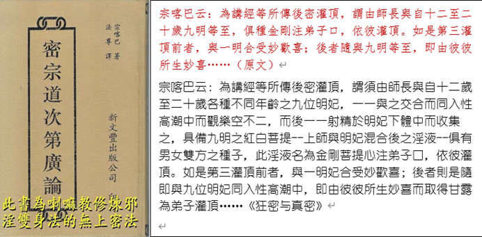 圖示:喇嘛教黃教格魯派宗喀巴大濕所流傳之《密宗道次第廣論》以印度教性力派邪淫 之法取代清淨佛法修行,令當今佛門淫欲氾濫,無數女眾被雙修身心受重創,餘者人人自危。佛門安在?! |