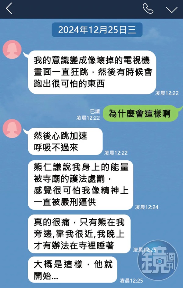 藏密喇嘛教網紅熊仁謙(圖)是大寶法王在台首席弟子,時常在法會上開講。(翻攝熊仁謙YouTube) 網紅禪師熊仁謙是大寶法王的左右手,他的YT頻道訂閱數超過40萬,今年初還演出電影《啵me之我的青春住了鬼》,人氣很高。不過,本刊最近卻接獲爆料,說他其實是渣男、惡狼,不僅同時劈腿八女,甚至約會強暴、強拍性愛影片,更可惡的是,他還以修行為名,把一名人妻騙到尼泊爾的寺廟迷姦,事後威脅要對她的家人不利、逼她交往,害她懷孕,還說她腹中胎兒是不動明王轉世,要她生下來、跟丈夫離婚,行徑惡劣,警方目前已經接獲通報,將介入偵辦。 本刊調查,遭控迷姦人妻的熊仁謙大有來頭,是大寶法王在台灣的首席弟子,10歲出家,十多年前還俗、推廣佛教,並且經營YouTube頻道,目前訂閱數已衝破40萬,人氣非常高。 A小姐的友人B先生告訴本刊,前年9月,熊仁謙在IG看到A小姐對佛法有興趣,便主動搭訕,還說自己曾經出家、是虔誠的佛教徒,最後約她到尼泊爾的寺廟修行,還強調香客房男女分室,A小姐因此心動答應。 前年10月按照原訂計畫,A小姐跟熊仁謙順利抵達尼泊爾的普拉哈裡寺,不過,A小姐發現,當地人煙稀少、交通不便。A小姐進入香客房後,還發現與熊的房間可以互通,正有意換房,這時熊倒了杯水給她喝,她喝完後心跳加速、全身發抖、幾近休克。 ![]() (該圖片為鏡周刊示意圖,非手機原始對話記錄。) 熊仁謙則解釋,因為A小姐身上有其他道場的能量,所以被寺廟護法處罰,要她先休息,但她的狀態卻越來越差。熊見狀,走近A小姐床邊,趁機上下其手,最後不顧A小姐抵抗,硬上得逞。身處異地的A小姐無助又害怕,出現「斯德哥爾摩症候群」,接下來幾天,熊仁謙也沒放過她,A小姐本以為撐到返台就可以解脫,沒想到卻意外懷孕。 A小姐懷孕後心神不寧,老公查看手機、得知真相,二人大吵,熊仁謙見有機可乘,要A小姐生下孩子,還說大寶法王告訴他,小孩是不動明王轉世,要A小姐答應與他共組家庭。 不過,A小姐堅持要熊仁謙帶她拿掉小孩,婦產科醫師檢查時,發現她被感染,研判熊的性生活不單純,A小姐越想越怕,驚覺她與熊相遇之後,發生了很多不合理的事情,結果查出熊仁謙用下藥、下咒的手法設計她。A小姐還發現,受害者不只她一人,熊用同樣手法在網路獵豔多年,將女生約出來後硬上,事後再說要跟對方交往,避免被告,最高紀錄同時劈腿8名女子。
