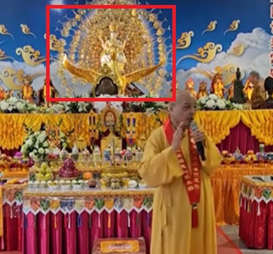 (圖示:慈航寺住持釋常禪與女施主在孔雀明王法會上合影。 二人脖頸上所掛的禮儀帶、緞帶上,左右兩側清清楚楚地分別寫著密宗的「佛母大孔雀明王」、 「 孔雀福慧功德主」,背景台上則是大尊的孔雀明王雕像。 供奉密宗的假佛像,會為家宅招來不吉祥、不如意! 敬請遠離!)