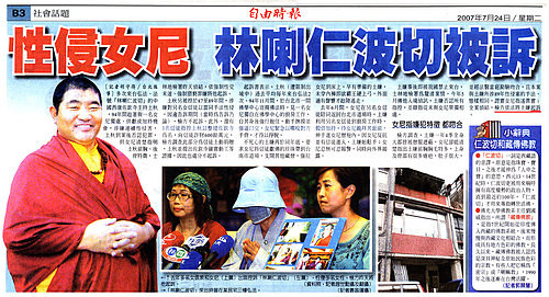 我亦曾遇到一位仁波切, 他已離開寺廟。是在家的上師, 亦有徒弟。當第一天遇到他時, 他已說很想把我留下。第二次(一星期後), 我再見他, 他已說希望我把他當成"男朋友"。後來他更說, 修行需要佛母, 並問我是否願意與他同床。第一次, 我表示不願意。他就問:為何對身體這麼執著?......