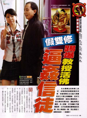 他並沒有放棄, 便說我是他150世以來的眷屬, 上世是他天界的愛妻, 所以心很貼近......當我跟他有了關係以後, 才發覺他同時跟別的女人睡, 花言巧語是少不了。亦有女弟子跟他有過關係, 他也有一子, 沒有結婚。